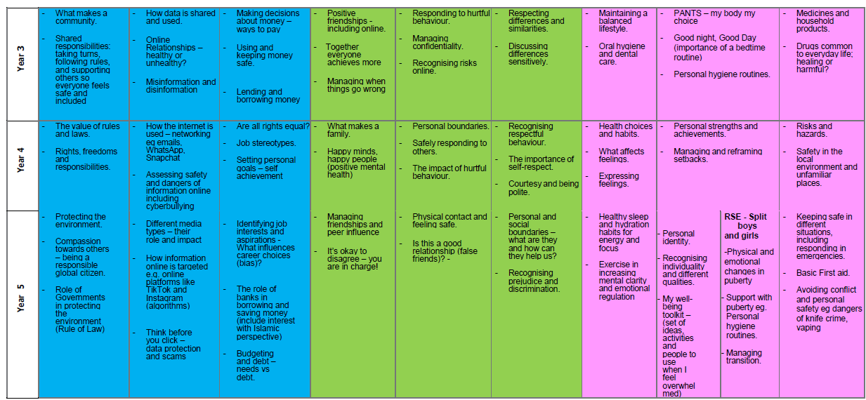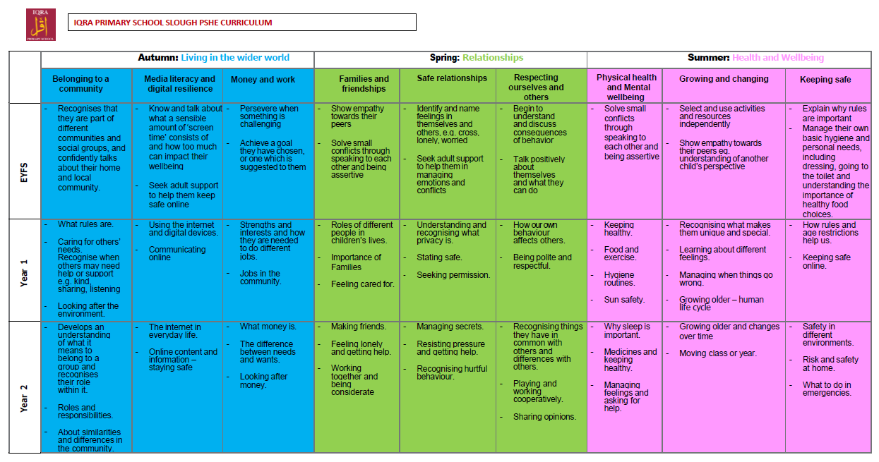 Our teaching of PSHE is within the context of the Islamic faith and in accordance with Islam’s moral teachings. Our 4 Core Values of Respect, Honesty, Cooperation and Compassion alongside Iqra school’s Characteristics of effective learning (independence, resilience, caring, critical thinking and creativity) are threaded into the three core PSHE strands: